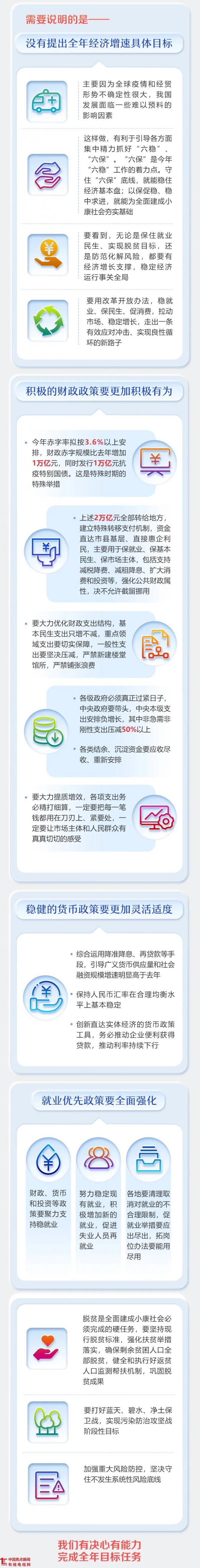 需要说明的是,我们没有提出全年经济增速具体目标,主要因为全球疫情和经贸形势不确定性很大,我国发展面临一些难以预料的影响因素。这样做,有利于引导各方面集中精力抓好“六稳”、“六保”。“六保”是今年“六稳”工作的着力点。守住“六保”底线,就能稳住经济基本盘;以保促稳、稳中求进,就能为全面建成小康社会夯实基础。要看到,无论是保住就业民生、实现脱贫目标,还是防范化解风险,都要有经济增长支撑,稳定经济运行事关全局。要用改革开放办法,稳就业、保民生、促消费,拉动市场、稳定增长,走出一条有效应对冲击、实现良性循环的新路子。