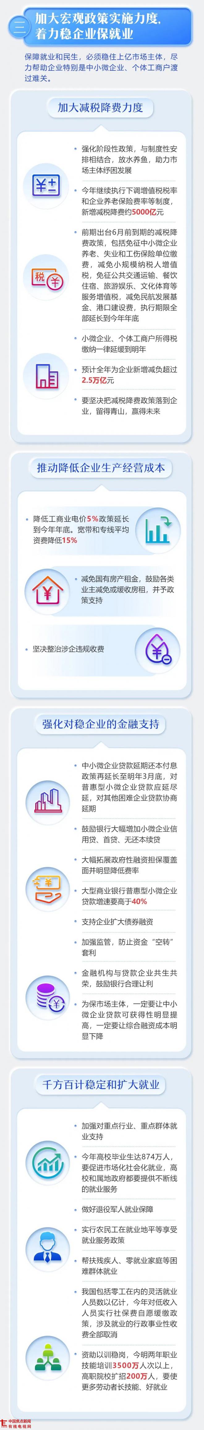 加大减税降费力度。强化阶段性政策,与制度性安排相结合,放水养鱼,助力市场主体纾困发展。今年继续执行下调增值税税率和企业养老保险费率等制度,新增减税降费约5000亿元。前期出台六月前到期的减税降费政策,包括免征中小微企业养老、失业和工伤保险单位缴费,减免小规模纳税人增值税,免征公共交通运输、餐饮住宿、旅游娱乐、文化体育等服务增值税,减免民航发展基金、港口建设费,执行期限全部延长到今年年底。小微企业、个体工商户所得税缴纳一律延缓到明年。预计全年为企业新增减负超过2.5万亿元。要坚决把减税降费政策落到企业,留得青山,赢得未来。