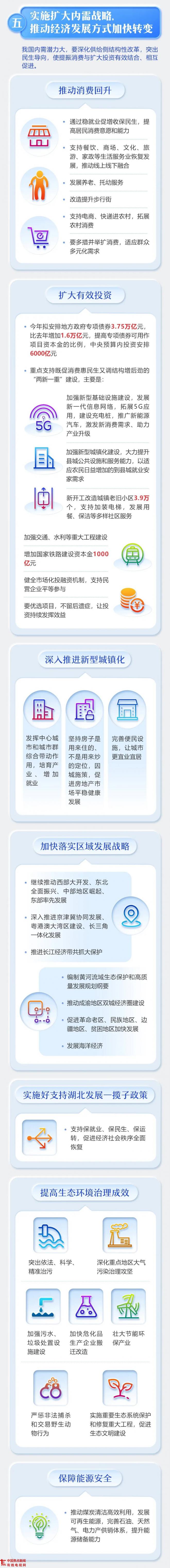 扩大有效投资。今年拟安排地方政府专项债券3.75万亿元,比去年增加1.6万亿元,提高专项债券可用作项目资本金的比例,中央预算内投资安排6000亿元。重点支持既促消费惠民生又调结构增后劲的“两新一重”建设,主要是:加强新型基础设施建设,发展新一代信息网络,拓展5G应用,建设充电桩,推广新能源汽车,激发新消费需求、助力产业升级。加强新型城镇化建设,大力提升县城公共设施和服务能力,以适应农民日益增加的到县城就业安家需求。新开工改造城镇老旧小区3.9万个,支持加装电梯,发展用餐、保洁等多样社区服务。加强交通、水利等重大工程建设。增加国家铁路建设资本金1000亿元。健全市场化投融资机制,支持民营企业平等参与。要优选项目,不留后遗症,让投资持续发挥效益。