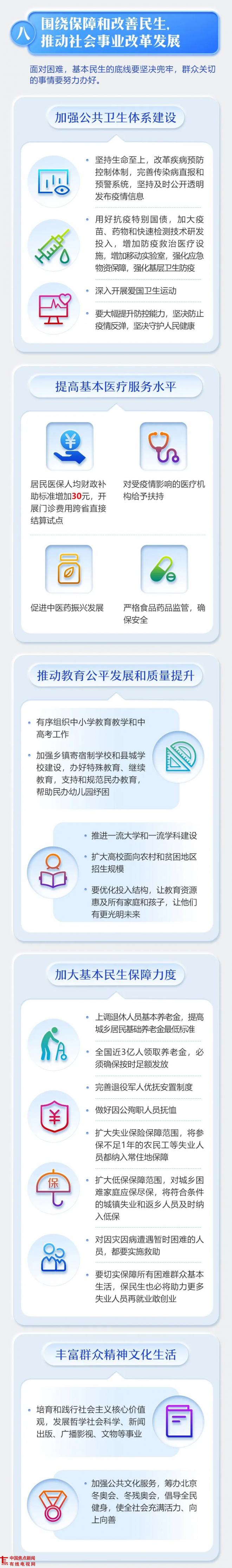提高基本医疗服务水平。居民医保人均财政补助标准增加30元,开展门诊费用跨省直接结算试点。对受疫情影响的医疗机构给予扶持。促进中医药振兴发展。严格食品药品监管,确保安全。