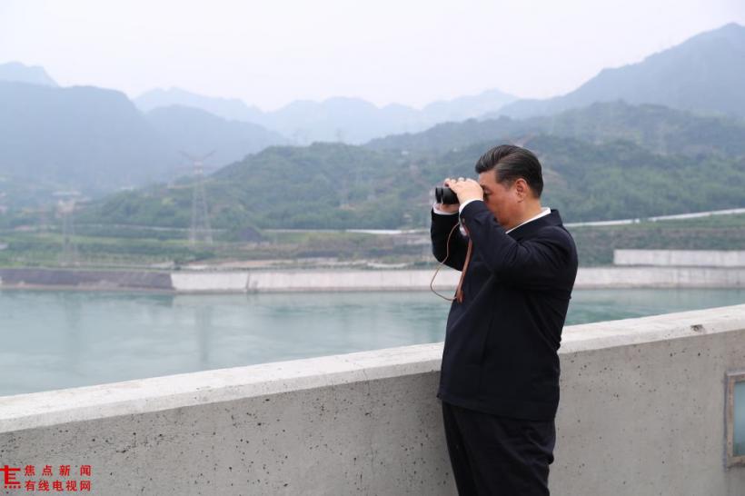 这是座谈会前,习近平于2018年4月24日下午在三峡大坝坝顶察看三峡工程和坝区周边生态环境。