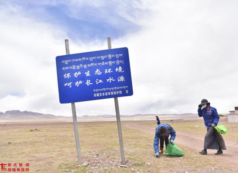 2019年5月28日,玛曲乡村民在捡拾垃圾。为保护长江源生态环境,西藏安多县玛曲乡每周都会在全乡范围内组织“保护长江源”捡拾垃圾活动,由各村党员志愿者带头,生态巡护员参与,群众自愿参加。