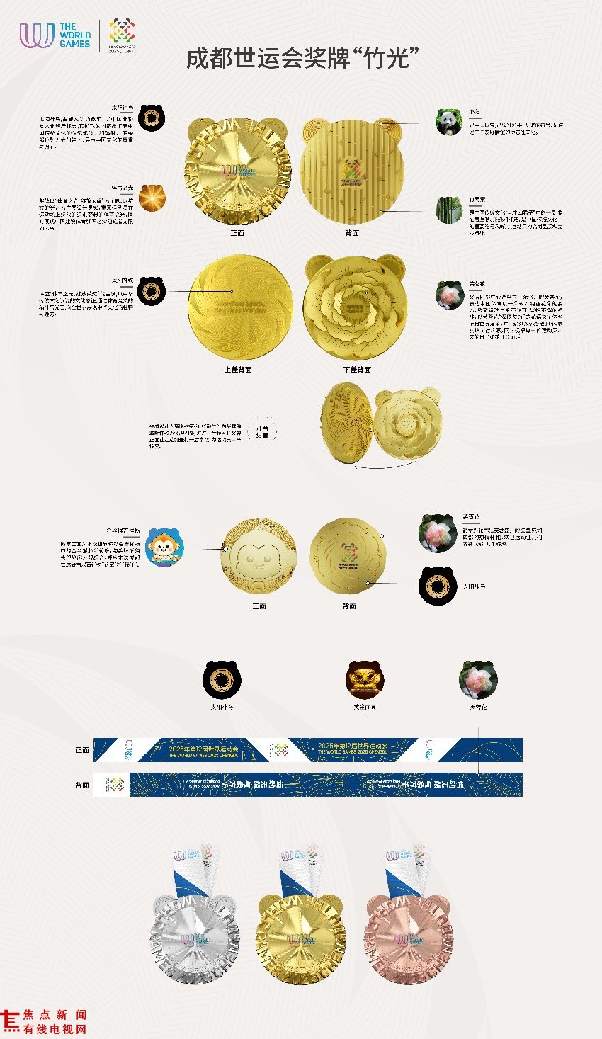 奖牌海报。成都世运会执委会供图 转向背面,赛事LOGO居于中心,设计灵感源于象征高洁与坚韧的中国竹文化——竹节与竹叶的造型,完美诠释了运动员勇攀高峰的向上精神。整体呈现的大熊猫“蜀宝”造型,则寓意着成都世运会以体育为桥梁,传递如国宝般珍贵的世界和平与友谊。 巧思匠“芯”,分享荣耀时刻 “竹光”最引人瞩目的突破,在于其精巧的内部结构,完美诠释了“分享”的核心理念。轻轻向左翻开奖牌正面,一枚独特的金属质徽章便呈现眼前:一面是灵动的川金丝猴“锦仔”,另一面则由太阳神鸟环绕成都世运会LOGO。