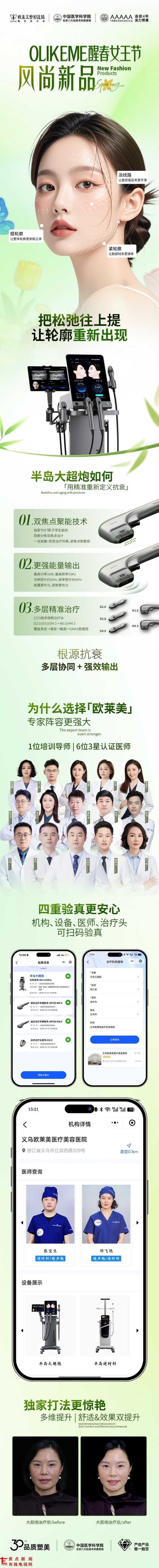 导语:春季新陈代谢加速,医美抗衰迎来“黄金窗口期”。在“醒春女王节”的热烈氛围中,欧莱美医疗美容集团正式发布春日特别推荐项目——“半岛大超炮”,并同步公开其独有的“全层精准抗衰”技术美学体系。这不仅仅是一次仪器设备的迭代,更是欧莱美联合以张宝生院长为首的7位资深皮肤科医师,对“抗衰节奏”与“治疗效果”的一次深度重构。从双焦点聚能到四重验真,从“快慢哲学”到分层治疗,欧莱美在回答一个核心命题:如何让抗衰更精准、更安心、更具长期价值?