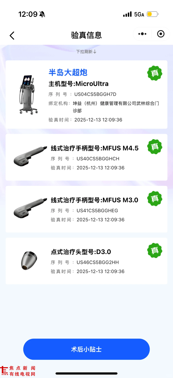 在设备真伪、探头复用乱象频出的背景下,欧莱美同步推出“四重验真”体系:机构资质、设备、治疗头、操作医师认证——均可通过扫码实时查询。这意味着,每一发大超炮的能量来源、操作者资质、耗材合规性都透明可追溯。