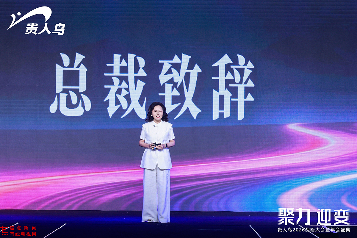 “战略创新是方向,战略落地是力量。”随着主持人的介绍,大会迎来了贵人鸟总裁吕秀兰女士在战略分享环节。总裁先用一段视频回顾加入贵人鸟品牌427天的每一步奋斗足迹,随后正式发布2026战略方向: