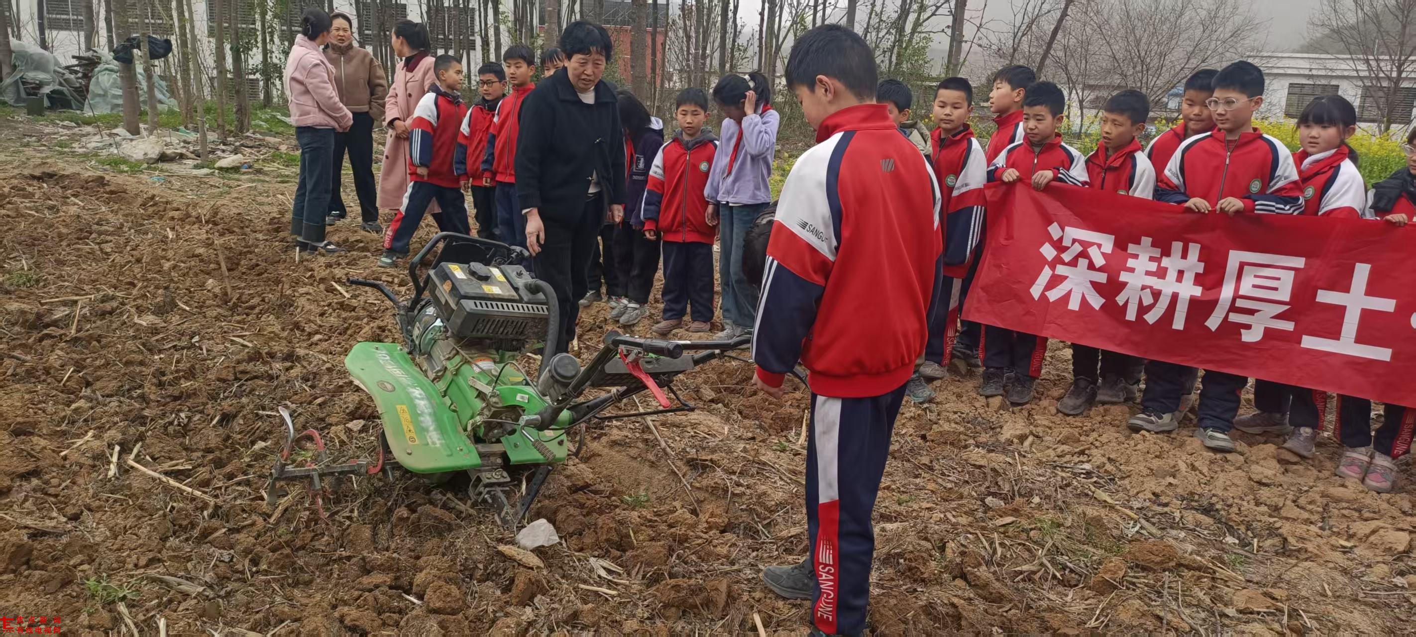 活动伊始,是土地平整环节。学校特意邀请了专业的犁地机械,犁地时,发动机的轰鸣声瞬间打破了乡村田野的宁静。小巧的犁铧深入泥土,将沉睡一冬的土地翻开,新鲜的泥土气息扑面而来,一切孕育着浓浓的希望和生机。同学们的目光紧紧跟随,眼中满是好奇与惊叹,纷纷围在机械旁,仔细观察机械如何将板结的土地变得松软,学到了平时课堂上学不到的知识,收获了不一样的感受。