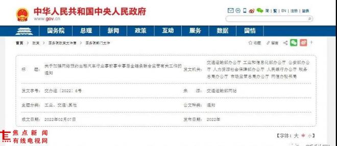 近日,交通运输部、工业和信息化部、公安部、人力资源和社会保障部、中国人民银行、国家税务总局、国家市场监督管理总局、国家网信办八部门联合修订发布《关于加强网...