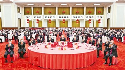 人民大会堂宴会厅灯光璀璨、暖意融融,各界人士齐聚一堂、共迎新春,现场洋溢着欢乐祥和的节日气氛。