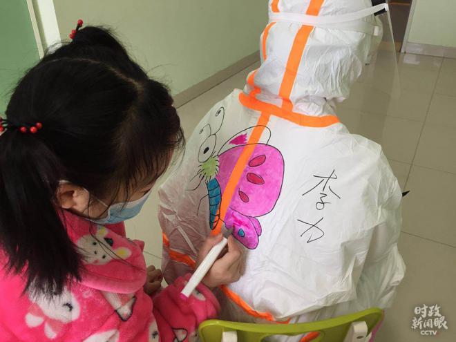 △住在武汉儿童医院的新冠肺炎患儿,看到被防护服层层包裹的医务人员,第一反应是害怕和抗拒。护士王佳平时很喜欢画画,她灵机一动,想到在防护服上画画与小朋友交流,让他们通过画来认识医务人员,减轻恐惧,增进感情。(武汉儿童医院提供)