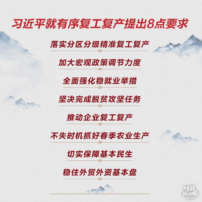 2月12日,习近平在中央政治局常委会会议上提出,非疫情防控重点地区要分区分级制定差异化防控策略,统筹疫情防控与经济社会秩序恢复。21日,他主持召开中央政治局会议,会议的一大重点就是部署统筹做好疫情防控和经济社会发展工作,提出“要建立与疫情防控相适应的经济社会运行秩序。”两天后,统筹推进新冠肺炎疫情防控和经济社会发展工作部署会议召开。