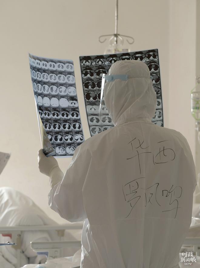 △1月31日,四川第一批援鄂医疗队队长罗凤鸣查房时,对比察看病人CT。(总台央广记者葛朝兴提供)