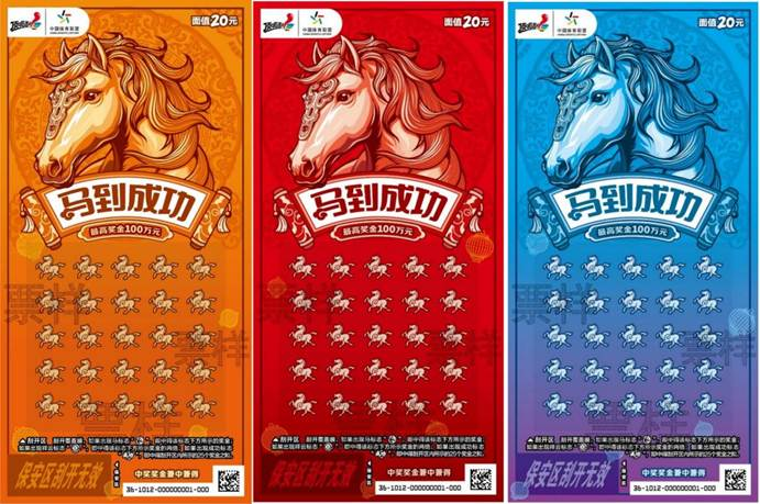 “午马”面值5元,最高奖金为10万元。共有9个票面场景,票面以九个经典的“马”字吉祥词语为主元素进行创意设计,例如“马到成功”“一马平川”“以梦为马”等,每个场景通过不同的剪纸艺术风格与视觉元素,传递美好祝福。今年依然采用了九联张形式展示,九张票面拼在一起可以组成一张骏马剪纸窗花图样,以工艺美术剪纸和创意字体融为一体,凸显传统“年味”。