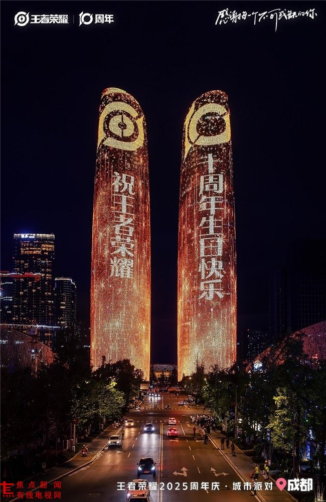 9月28日,双子塔、天府之檐、天府长卷等城市地标同步点亮周年庆主题灯光,共同营造出浓郁的庆典氛围,王者荣耀更是在当晚的活动仪式上宣布了贯穿整个十月的重磅节日活动。